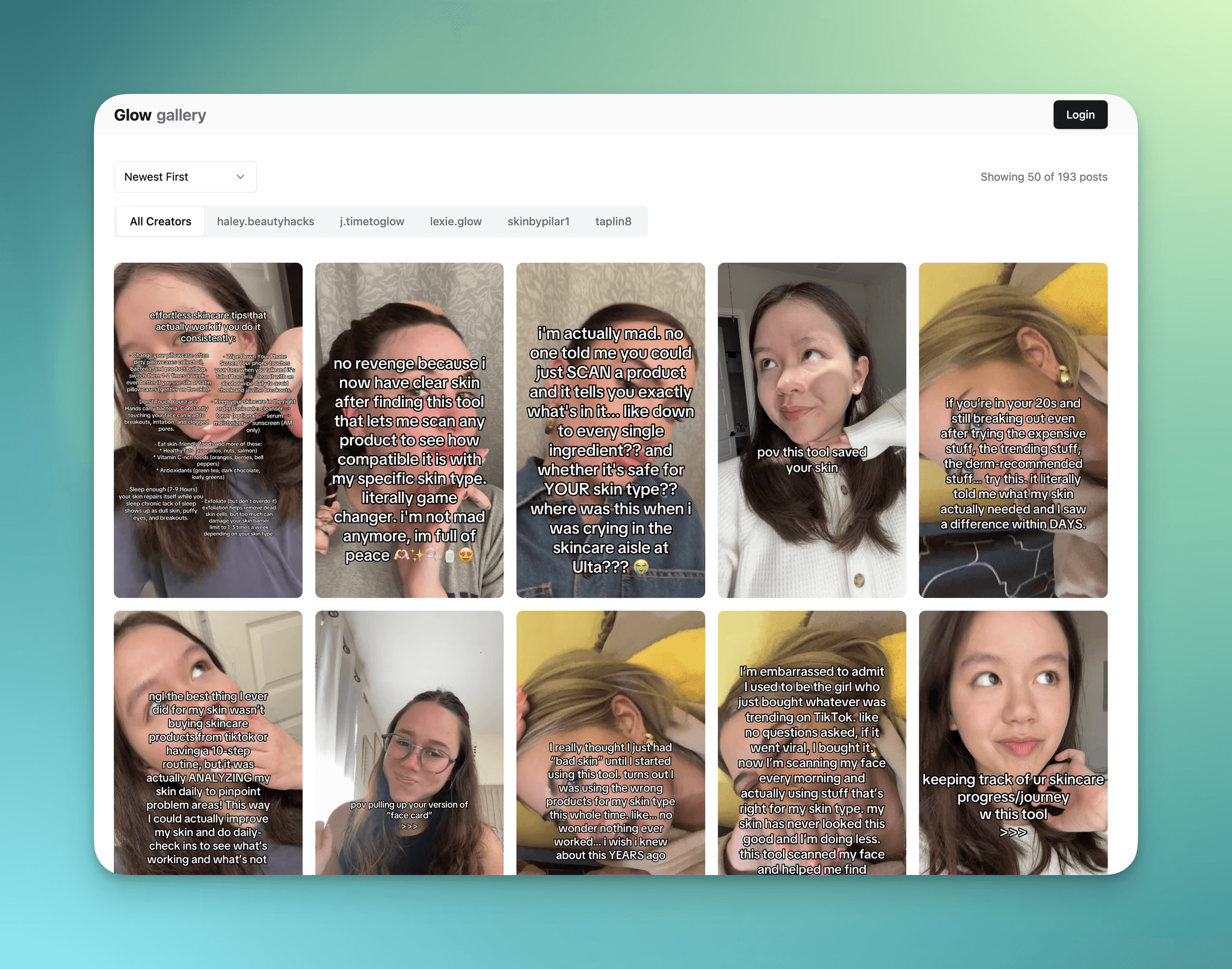 Gallery view was made with the intention of creating a new view that clearly shows and prioritizes TikTok thumbnails so you can identify the hooks being made. You can sort your saved videos by recently posted, views, likes and comments.