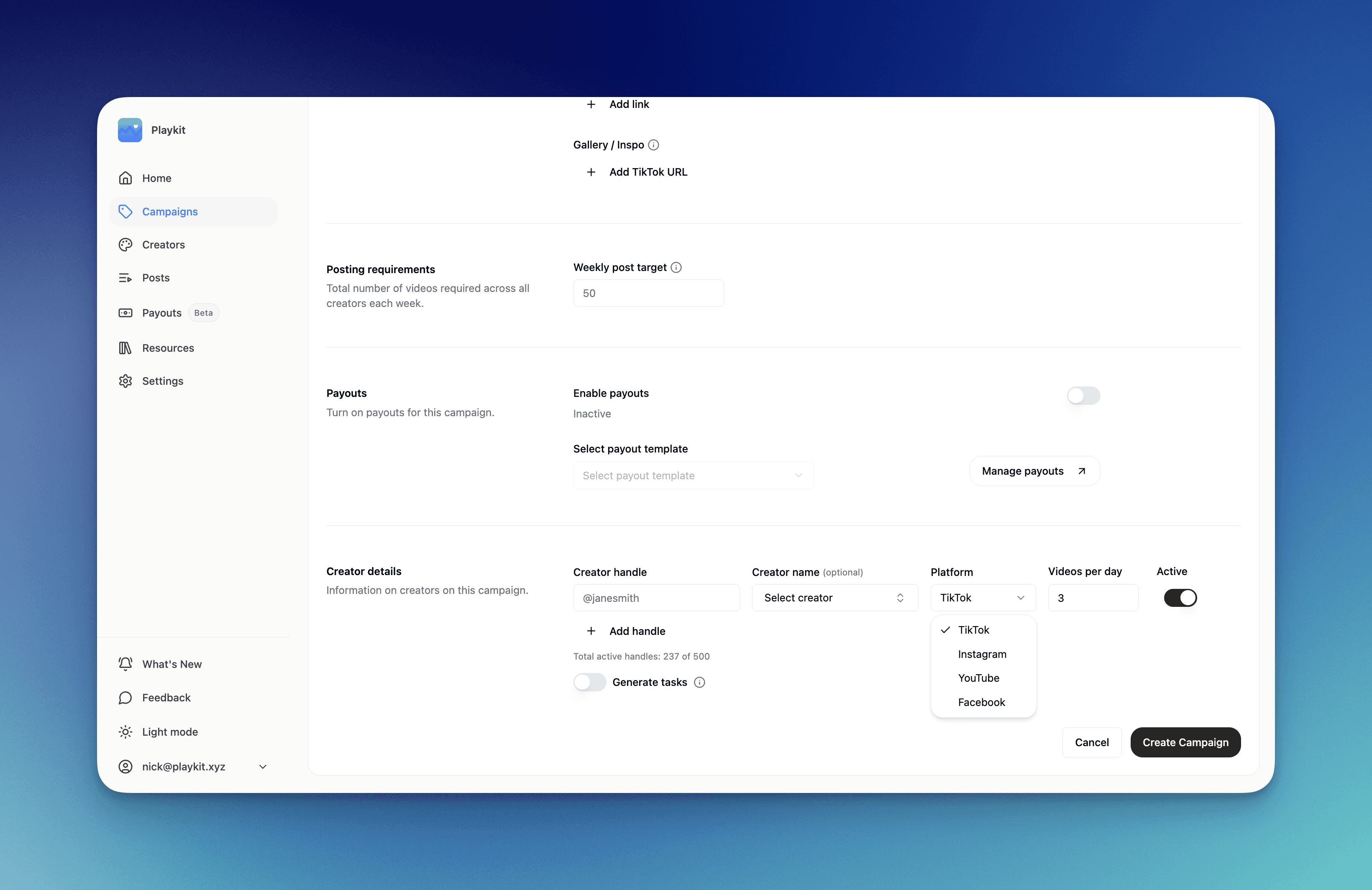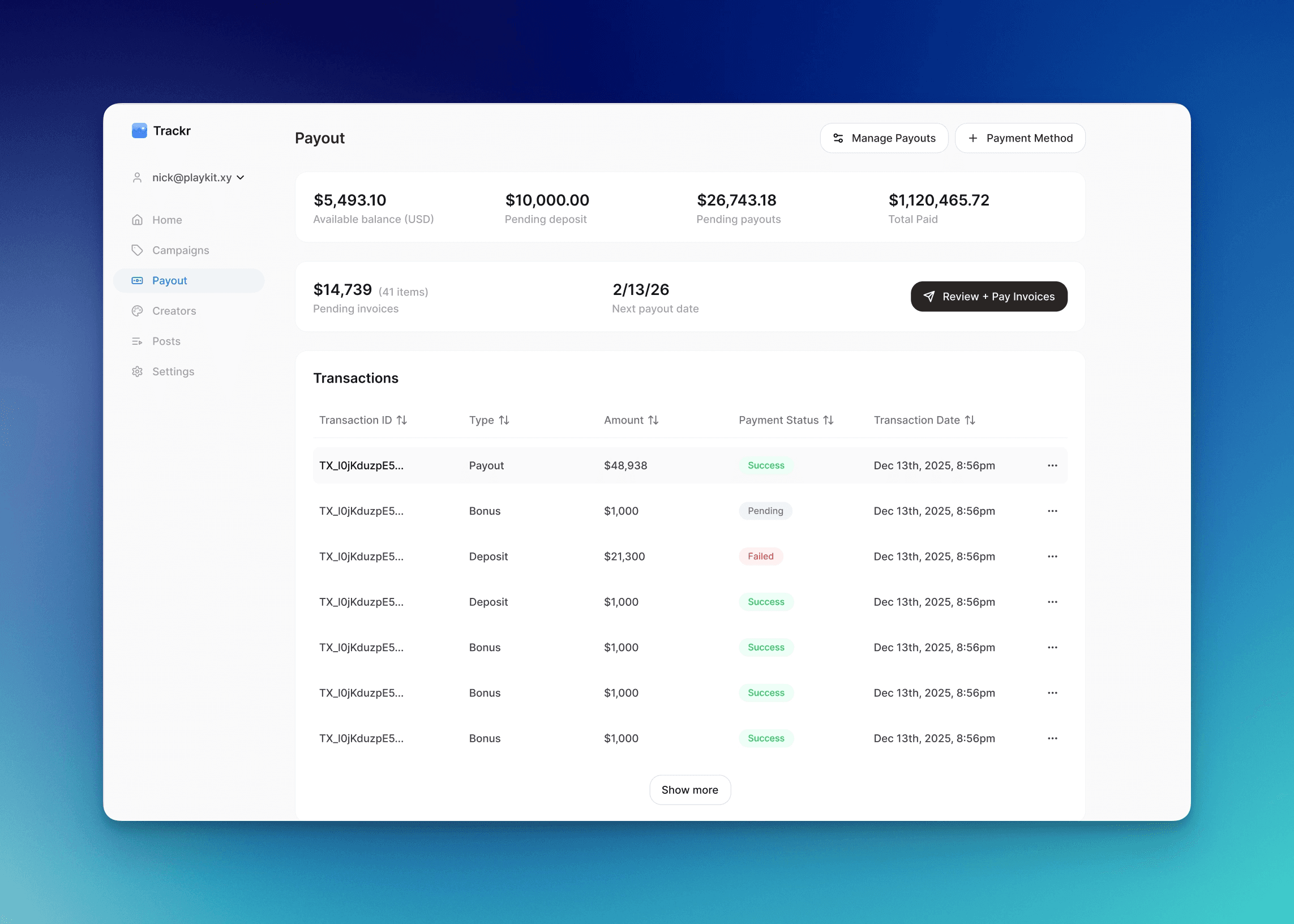 Payouts now calculate automatically based on performance and send directly to creators. 1099 generation included. No spreadsheets, no manual transfers, no year-end scramble. Book a demo call with us to get started.