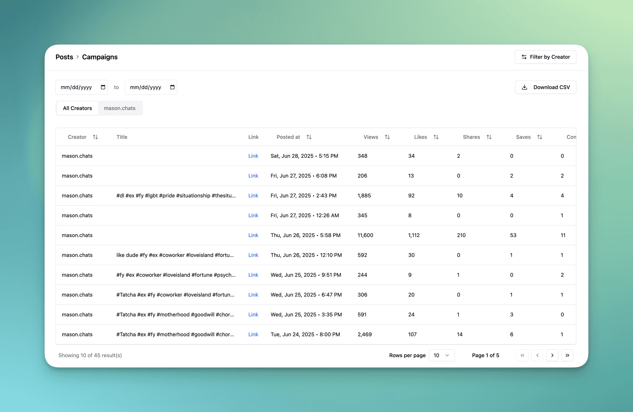 Download CSV takes into account all applied filters, which includes selected creators and/or any data range as well.