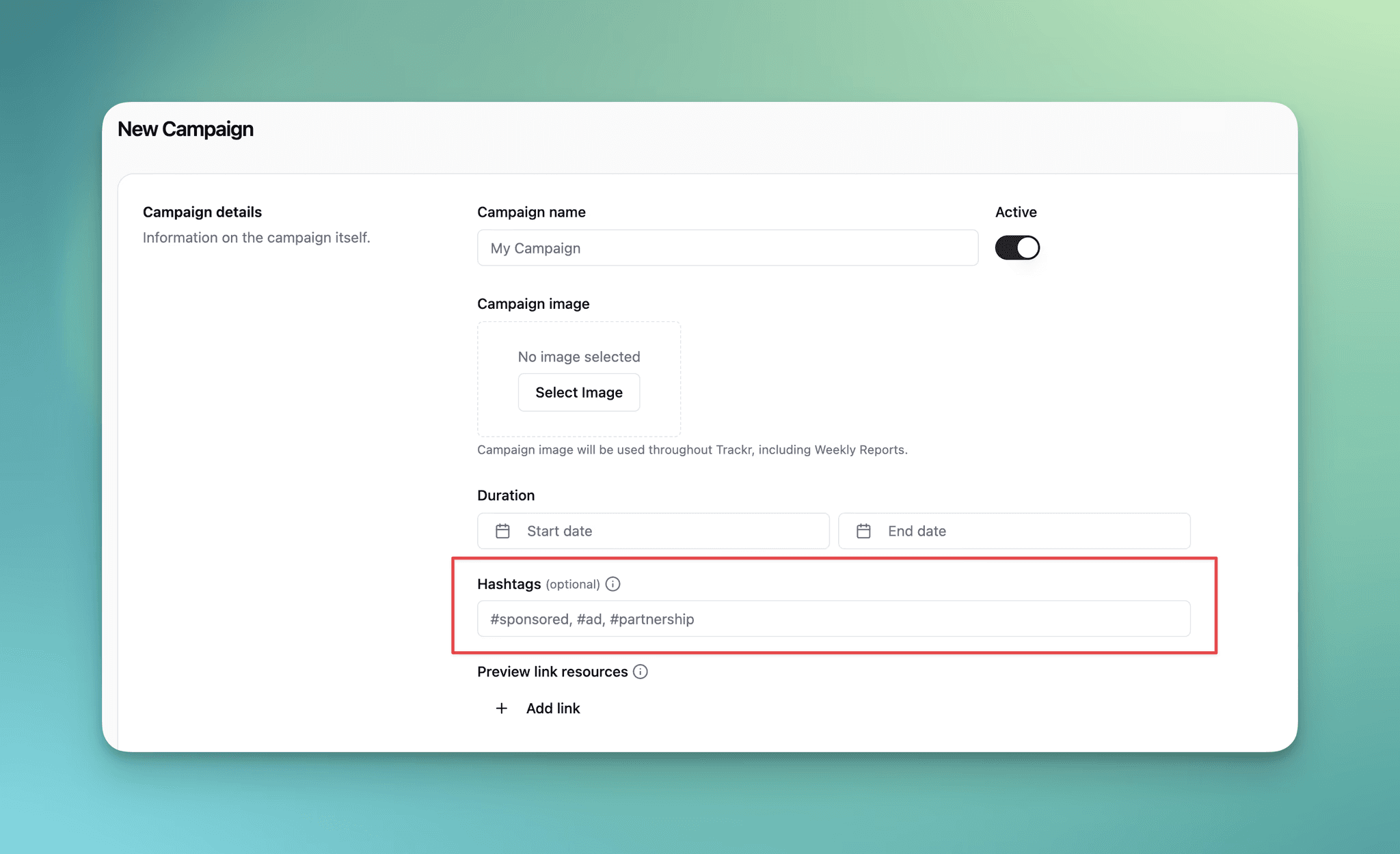 You can now add optional hashtags when creating or editing campaigns. When hashtags are specified, Trackr will only track posts that contain at least one of those hashtags - keeping your analytics focused on sponsored content.