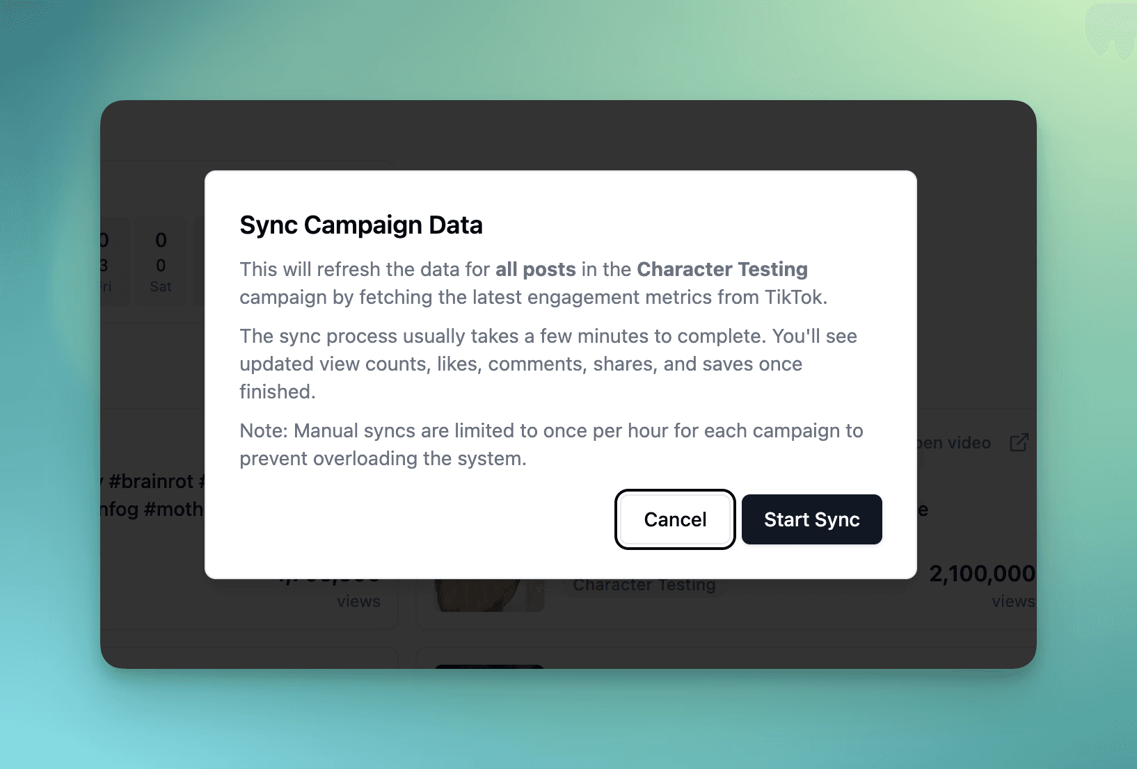 So, we answered! Trackr now supports manually refreshes for your campaign data, also called "Sync Data". This option allows you to see the most recent data (like views, likes, comments, etc.) for all posts in a campaign which is great for refreshing when you first login to Trackr.