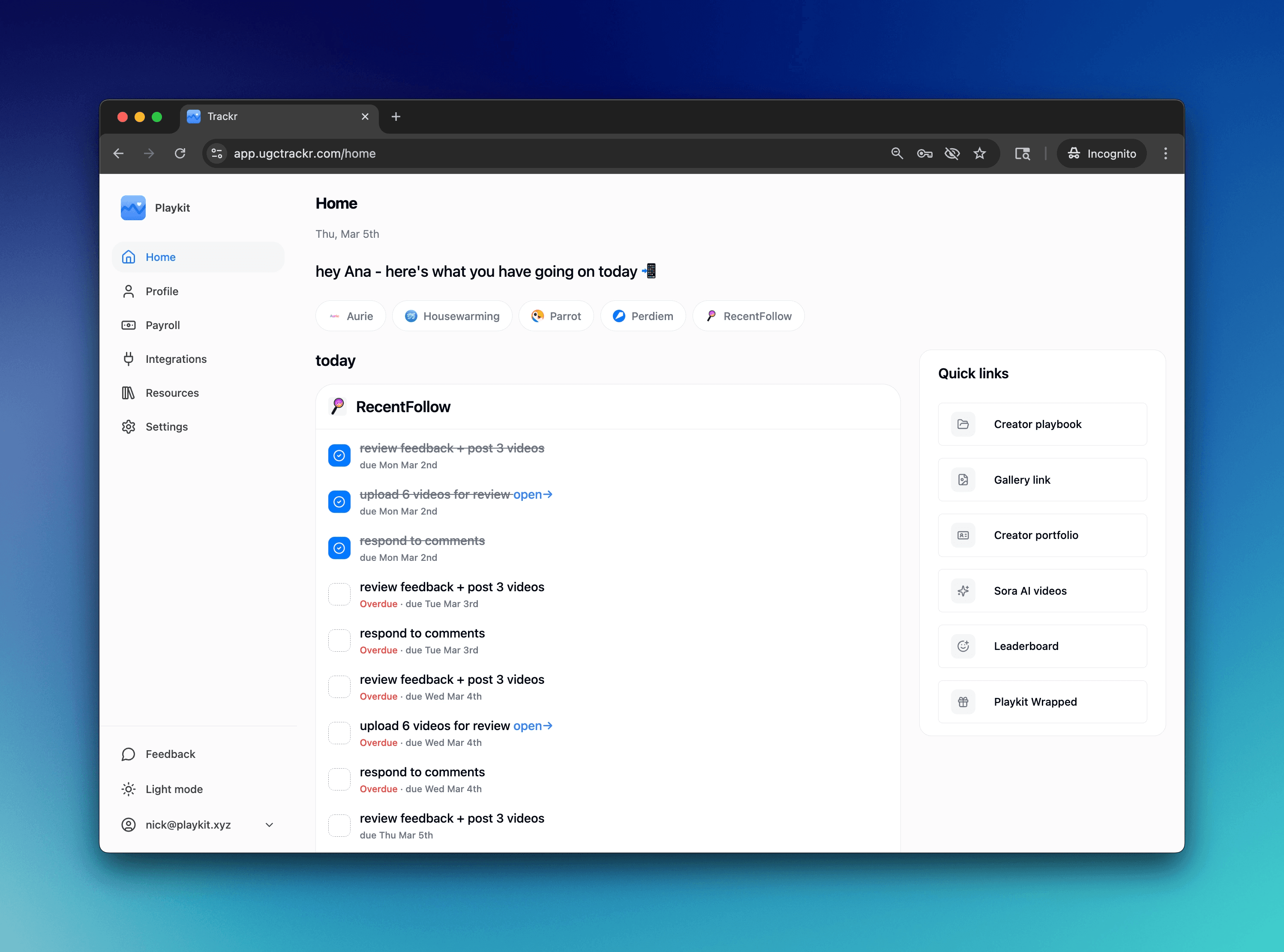 Every creator on your roster now has their own dashboard. They log in, see their tasks, check their ranking on the leaderboard, and track their pay. They stop messaging you for updates because everything they need is already there.
