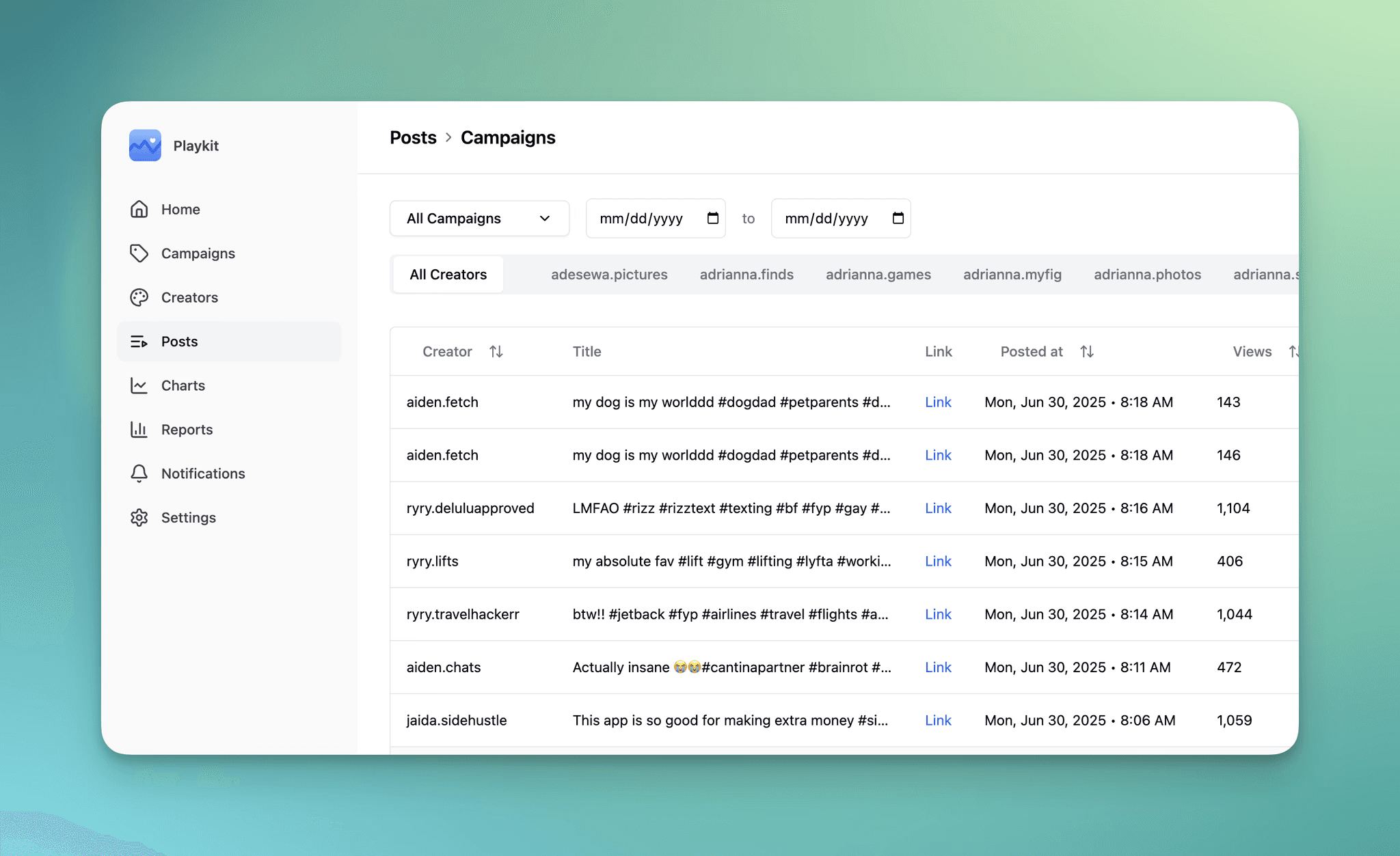 By popular request, Posts now have their own dedicated tab! While users can view Campaign-level or Creator-level data by first clicking on the Campaigns/Creators tab, you can also just right in through the new dedicated Posts tab: